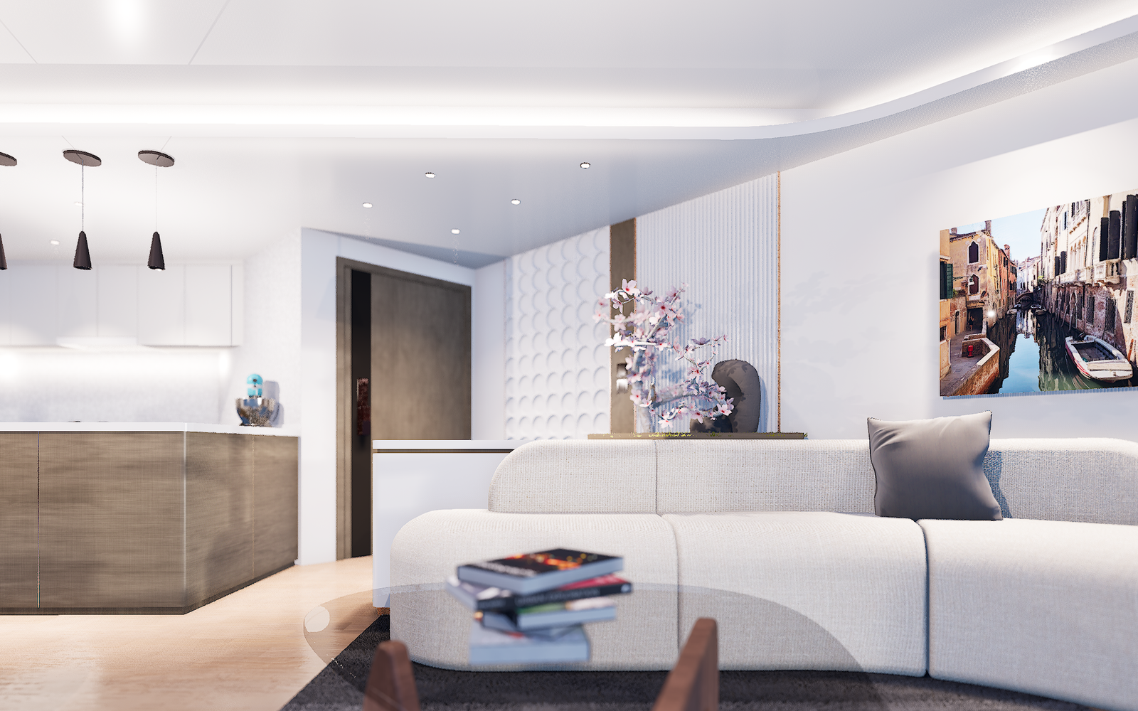 為一對退休夫婦和他們的小貓貓打造的室內翻新。這個849平方英尺的「碧濤花園」室內設計著重營造禪意氛圍,盡可能採用天然材質。柔和的曲線設計巧妙融合了起居空間和用餐區,禪意花園、燈光和牆板點綴著圓形元素。 LED燈光和照明,突顯了家中的藝術品。